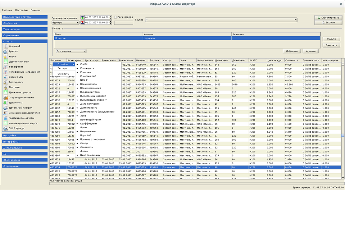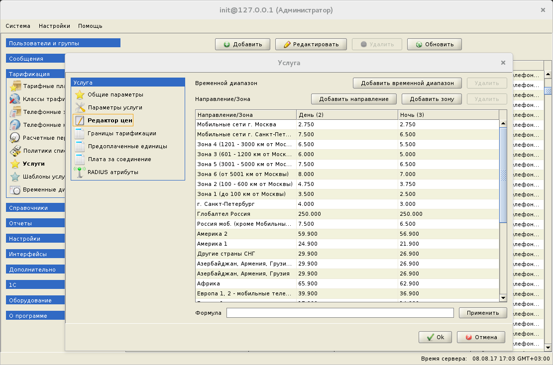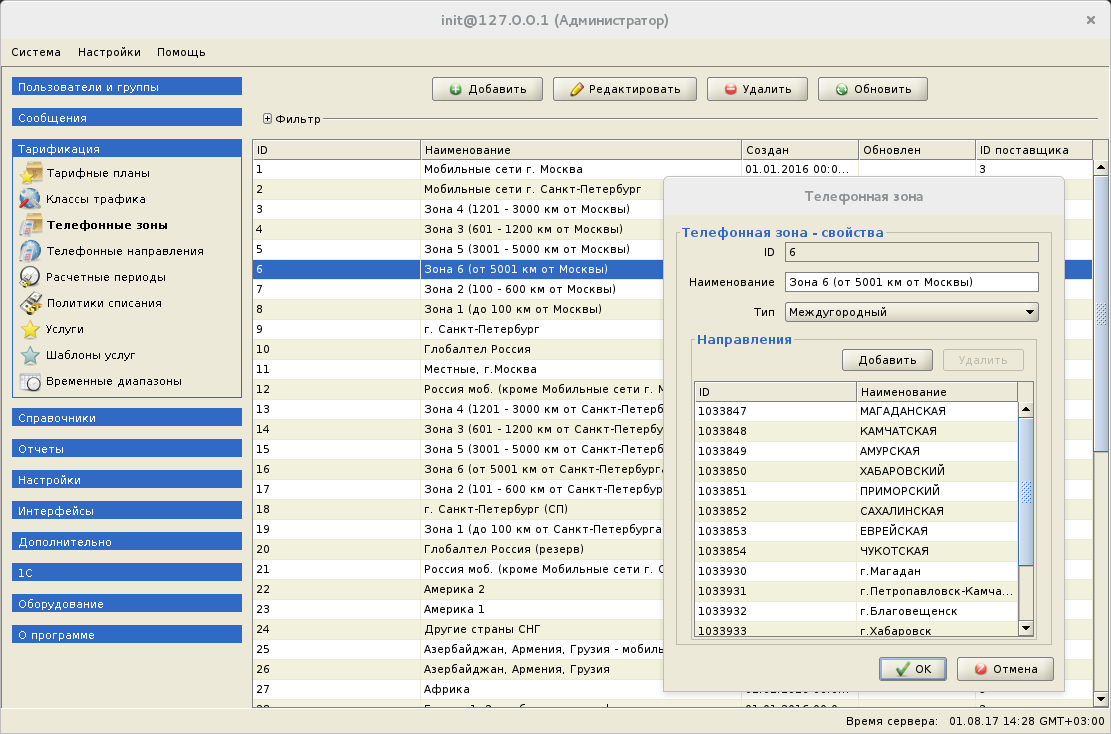 В тарифе Вы можете указать стоимость для каждого телефонного направления в отдельности или для зоны, которая включает в себя множество направлений, а составные тарифные планы позволят предложить клиентам индивидуальные гибкие тарифы. Например, скидку на звонки только в определенную зону. Вне зависимости от этого доступна повременная тарификация с бесплатным начальным периодом, различная точность округления в зависимости от продолжительности разговора, включенные в абонентскую плату минуты и так далее.
